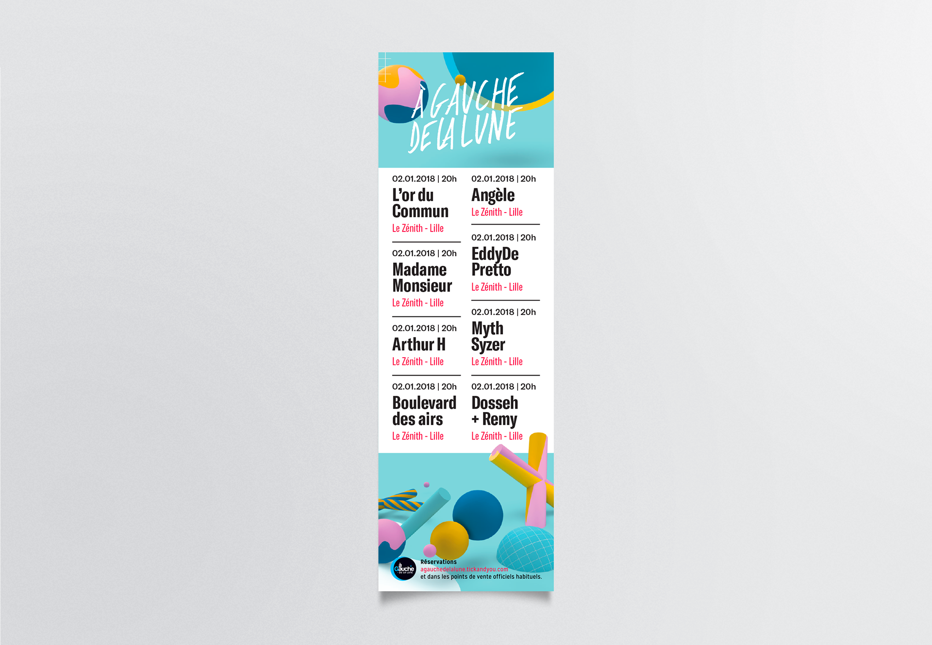 Proposition d'univers graphique de la saison 2019 de la société lilloise de production de concerts À Gauche de la lune.